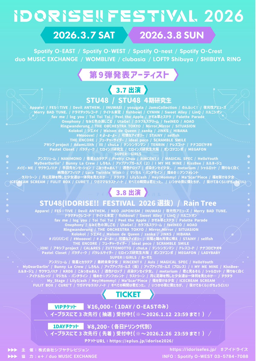 STU48 / STU48 4期研究生 / Appare! / FES☆TIVE / Devil ANTHEM. / INUWASI / JamsCollection /のんふぃく! / 夜光性アミューズ / Merry BAD TUNE. / ドラマチックレコード / タイトル未定 / fishbowl / CYNHN / Sweet Alley / LinQ /ハルニシオン / fav me / log you / Toi Toi Toi / Peel the Apple / かすみ草とステラ / Palette Parade / Onephony / なみだ色の消しごむ / UtaGe! / カラフルスクリーム / feeINEO / AOAO / Ringwanderung / THE ORCHESTRA TOKYO / Mirror,Mirror / SITUASION / Kolokol / ジエメイ/ Maison de Queen / zanka / JINKS / HIBANA / #Mooove! / #よーよーよー / 可憐なアイボリー / STAiNY / selfish / THE ENCORE / フューチャーサイダー / ideal peco / SCRAMBLE SMILE / アキシブproject / AdamLilith / ill / chuLa / テンシンランマン / TENRIN / ドレスコード / ナナコロビヤオキ / Pastel Closet / パラディーク / ヒロインズ研究生 / ヒロインズ研究生大阪 / ポンコツコンポ / MEGAFON / SUPER☆GiRLS / アンスリューム / NANIMONO / 衛星とカラテア / Pretty Chuu / RiNCENT# / MAGICAL SPEC / HelloYouth / MyDearDarlin' / Bunny La Crew / しろもん/アップアップガールズ(2)/ I MY ME MINE / KissBee /ルルネージュ / メイビー ME / サクヤコノハナ
