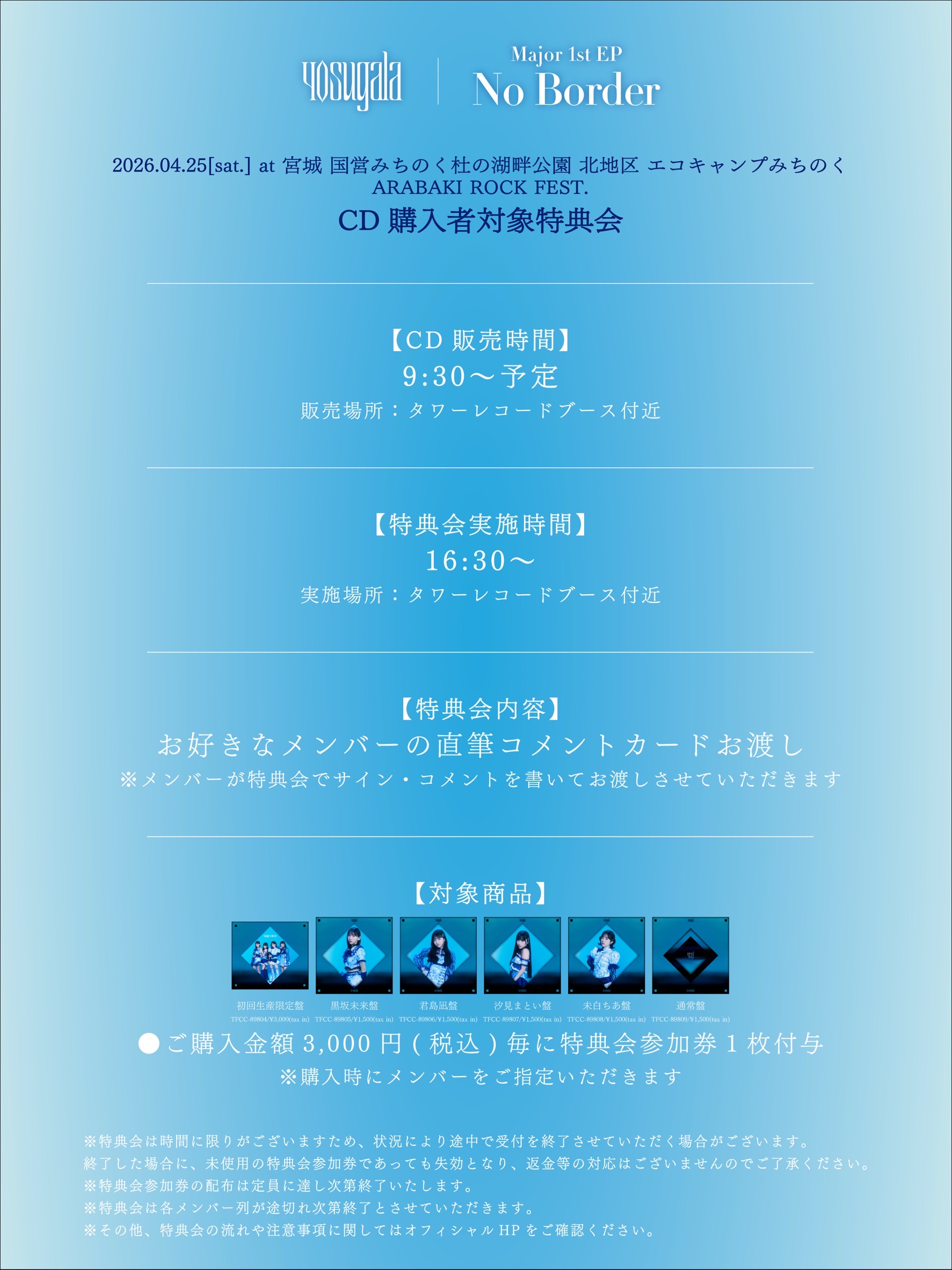 下記、イベント会場のCD販売ブースにて下記の対象商品をご購入いただいたお客様には、ご購入金額に応じて、「特典会参加券」をお渡しいたします。